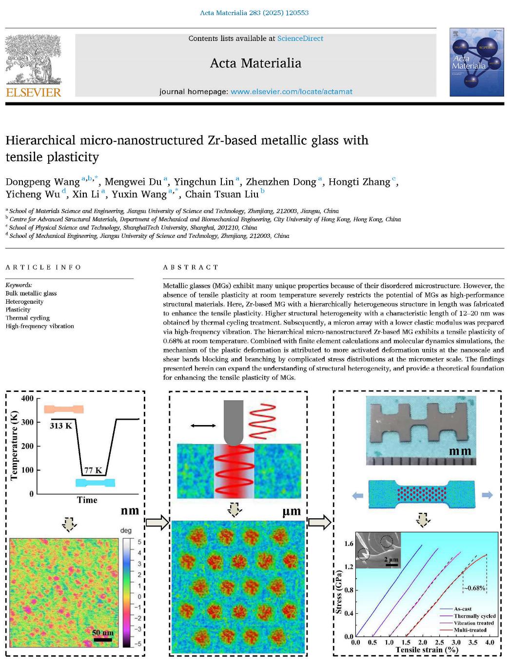 近日,我校材料學院王冬朋老師以江蘇科技大學為第一單位,在金屬材料頂級期刊《Acta Materialia》(中科院一區(qū)TOP期刊,影響因子8.3)上發(fā)表研究論文《Hierarchical micro-nanostructured Zr-based metallic glass with tensile plasticity》。
