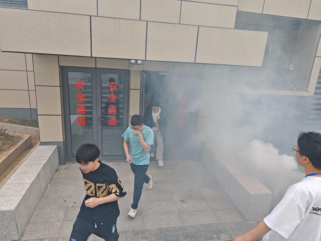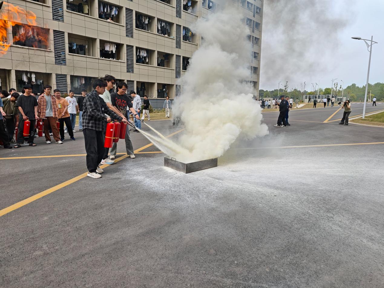 隨著消防警報聲響起,演練進入實戰(zhàn)環(huán)節(jié)。點火組按預案在公寓樓內(nèi)施放環(huán)保煙霧模擬火情,公寓值班人員立即啟動應急響應:立即報警、切斷電源、停運電梯、開啟應急通道。各樓層學生在疏散引導員的指揮下,捂住口鼻,彎腰低姿,按疏散路線有序撤離至戶外集結(jié)點。與此同時,滅火組使用滅火器迅速撲滅“火源”,完整演練了火災應急處置全流程。