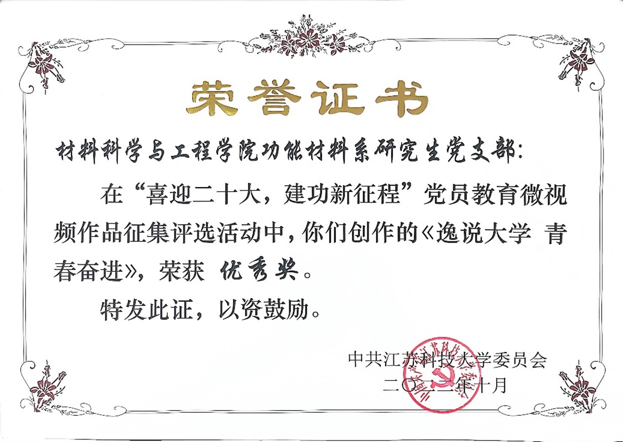 “喜迎二十大,建功新征程”黨員教育微視頻征集評選——優(yōu)秀獎;時間:2022年10月